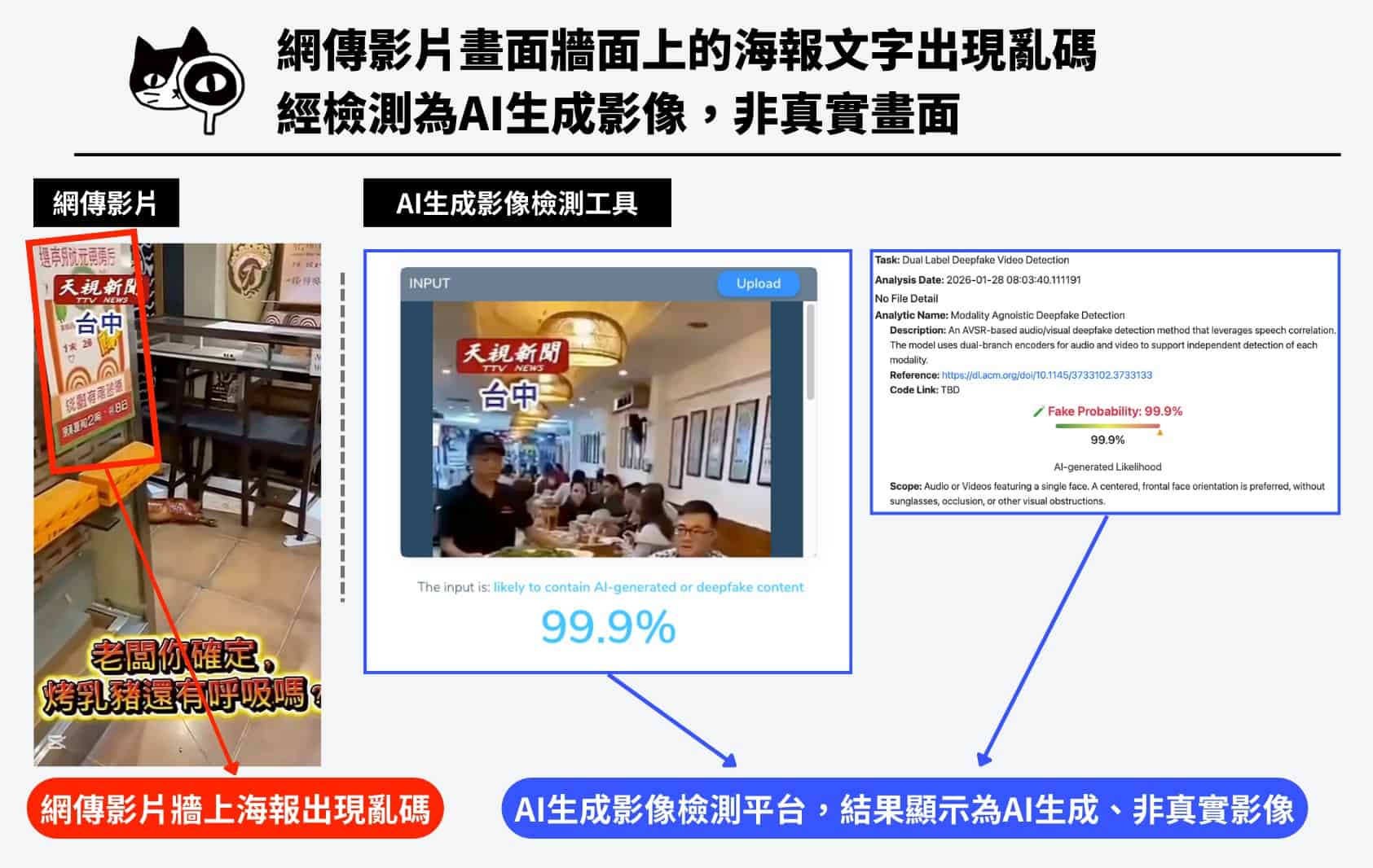 二、檢視網傳影片也可見AI生成畫面的痕跡,如:牆面上的海報文字出現亂碼。使用AI生成影像檢測工具「Hive Moderation」、「DeepFake O Meter」,檢測結果顯示有高機率為AI生成影片、非真實影像。