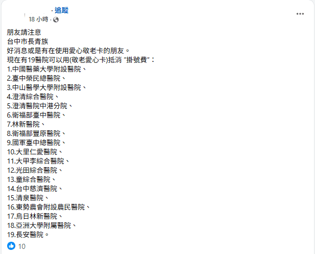 近期Line和臉書等平台熱傳訊息,宣稱台中市有19家醫院可以用敬老愛心卡抵銷掛號費。