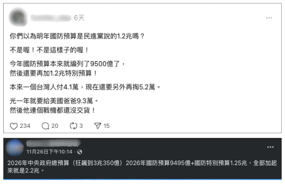 社群平台流傳訊息稱:「你們以為明年國防預算是民進黨說的1.2兆嗎?不是這樣子的喔,今年國防預算本來就編列了9500億,還要再加1.2兆特別預算」。另有傳言版本宣稱,「2026年國防預算9495億+國防特別預算1.25兆,全部加起來就是2.2兆」。