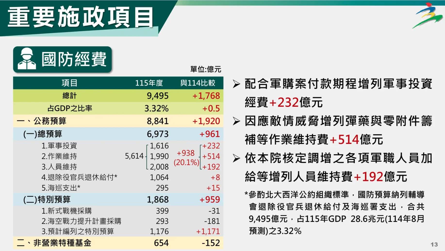 根據行政院網站,115年度國防預算按北約標準達9495億元(含退除役官兵退休給付及海巡支出),大項目為總預算6973億、特別預算1868億及非營業特種基金654億,占GDP比率3.32%。其中,特別預算編列1868億元(含海巡署76億),內容包含新式戰機採購399億、海空戰力提升採購計劃293億,及預計編列之特別預算1176億元。