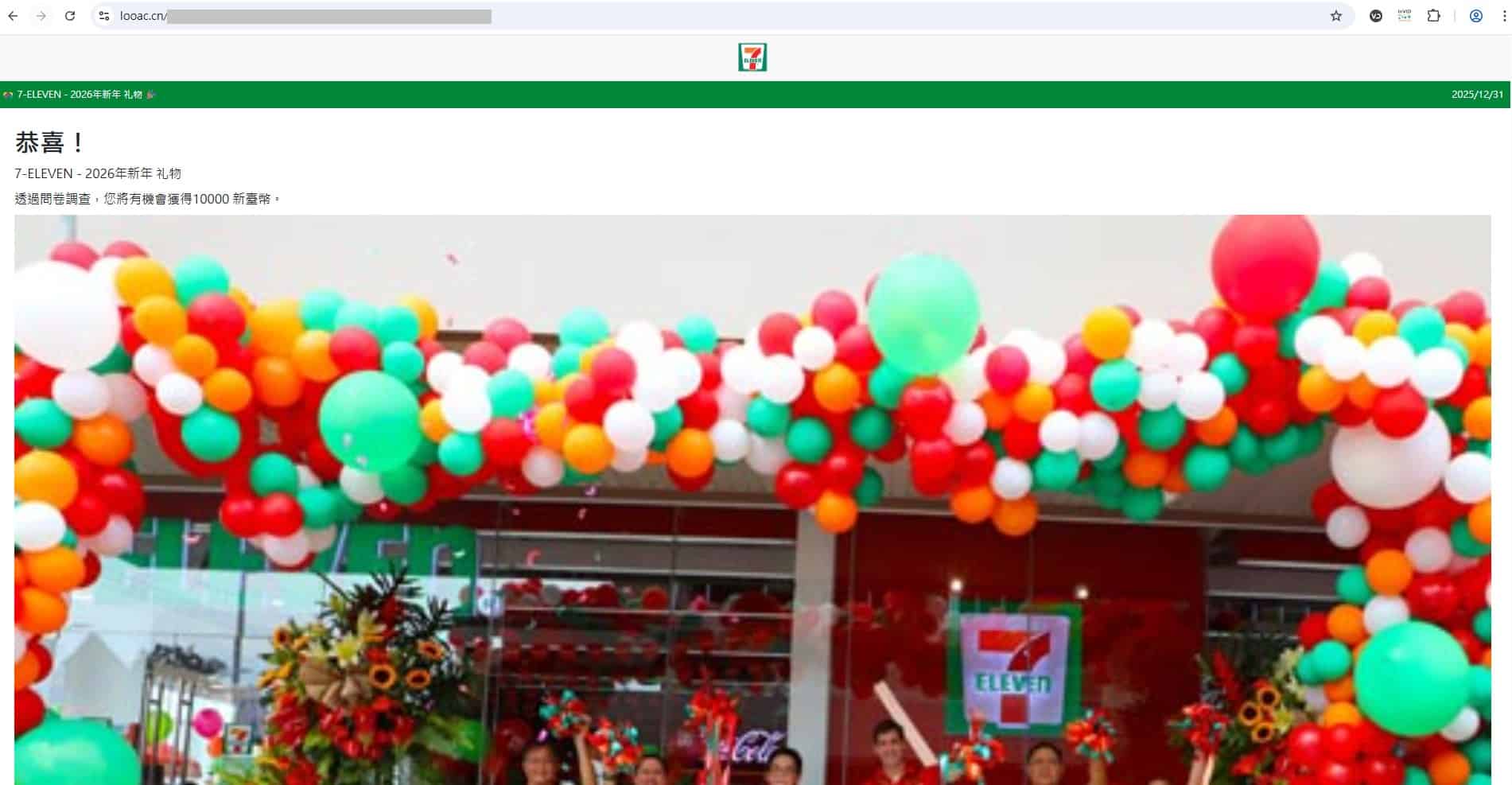 近日網路流傳一個聲稱為「7-ELEVEN 2026年新年禮物,透過問卷調查有機會獲得新台幣1萬元」的網址,點入後回答4個問題即可抽獎。。