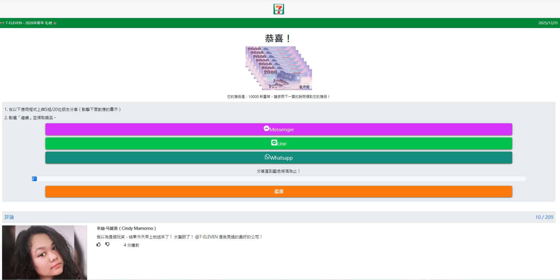 記者實際回答完問卷後開始抽獎,經過數次實驗後發現,抽獎時無論點選任何選項,都會在第二次抽中1萬元,在網頁下方也有許多「網友留言」,自稱中了大獎;該網頁會要求民眾透過臉書Messenger、Line或Whatsapp分享給20個朋友後,才能領取獎金。
