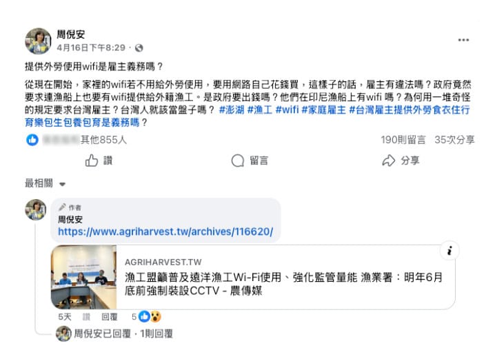 移工引進、政策管理成討論話題。近期有貼文指出,政府要求漁船裝設Wi-Fi設備給漁工使用,並質疑提供網路已成為雇主義務。實際上,台籍漁船的強迫勞動情況嚴重、違反勞權,加裝通訊設備可以讓漁工即時求援。該政策僅限於遠洋漁業,而且目前是「鼓勵性質」。