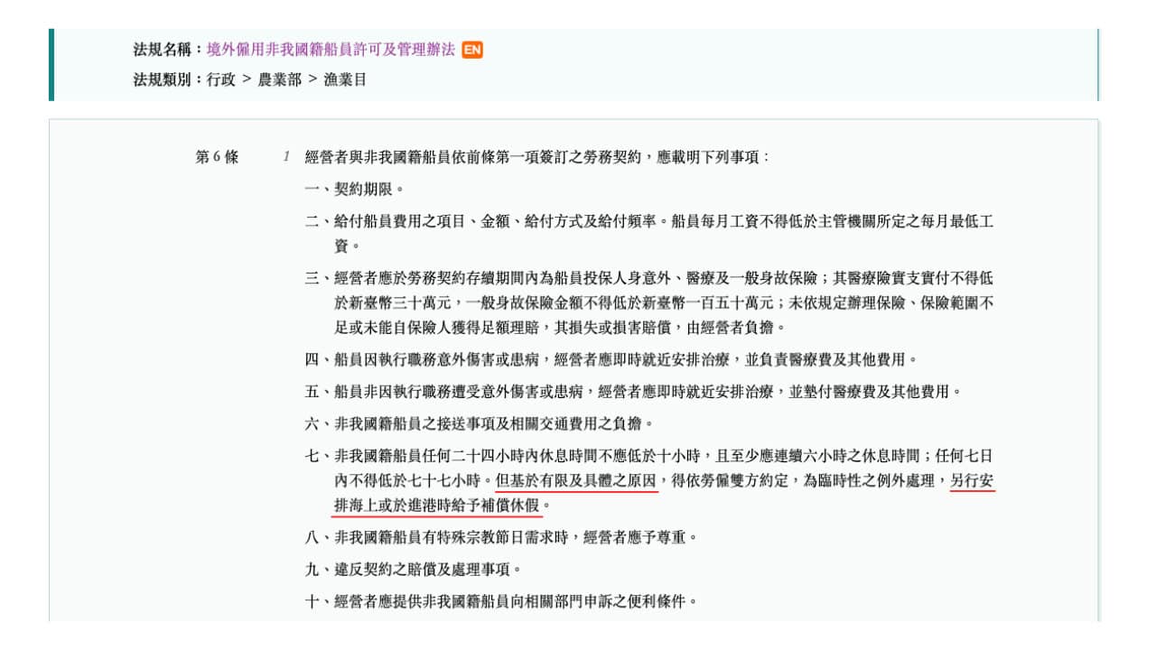 《境外僱用非我國籍船員許可及管理辦法》第六條。(全國法規資料庫)