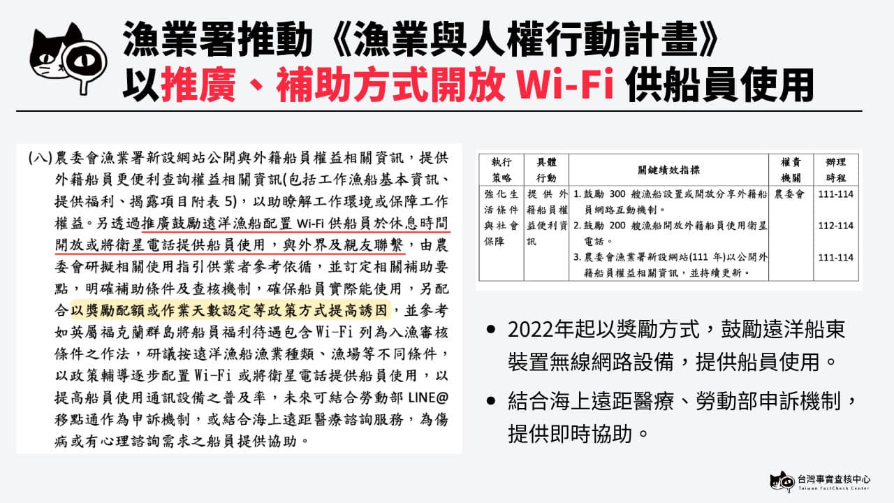 漁業署《漁業及人權行動計畫》鼓勵遠洋漁船加裝Wi-Fi設備,並已明確補助條件及查核機制,確保船員能實際使用。