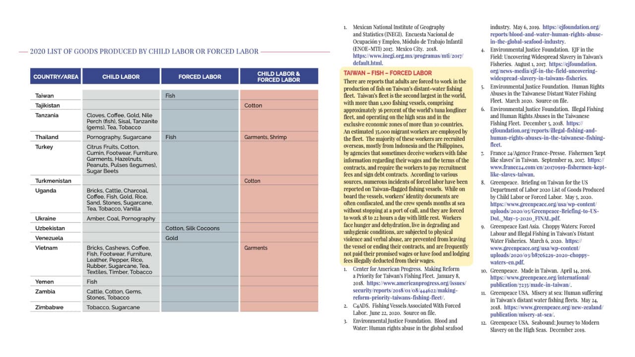 今年3月起,美國針對包括台灣在內的60多個國家啟動「301條款調查」,並優先啟動有關強迫勞動的調查。根據《工商時報》報導,綠色和平海洋專案主任郭珮嫻表示,台灣漁業長期存在被迫勞動的風險,恐怕面臨嚴峻的經貿危機。