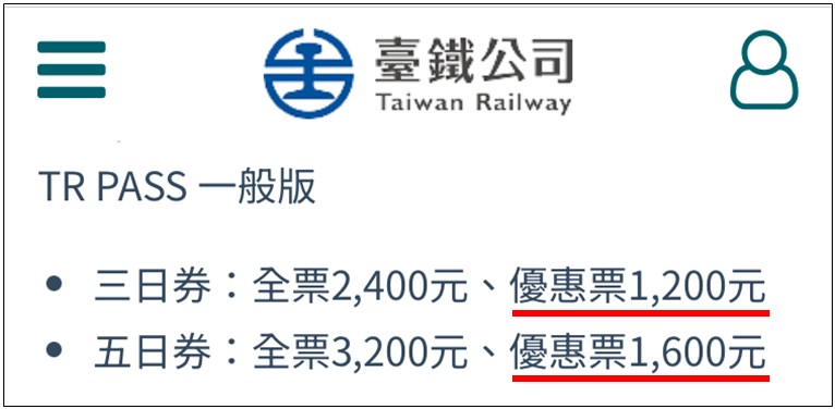 「TR-PASS」3日券票價是2400元,5日券則是3200元,年滿65歲可用半價購買,分別是1200、1600元。除了長輩之外,領有身心障礙證明民眾、未滿12歲兒童都能享有半價優惠。
