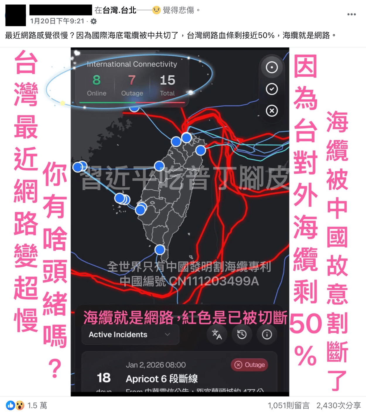 網路流傳圖片宣稱,網路變慢是因為台灣對外海纜剩50%、被中國割斷等;經查,傳言引用「台灣海纜動態地圖」資料,但錯誤理解地圖紅線的意涵,紅線並不代表整條被切斷。