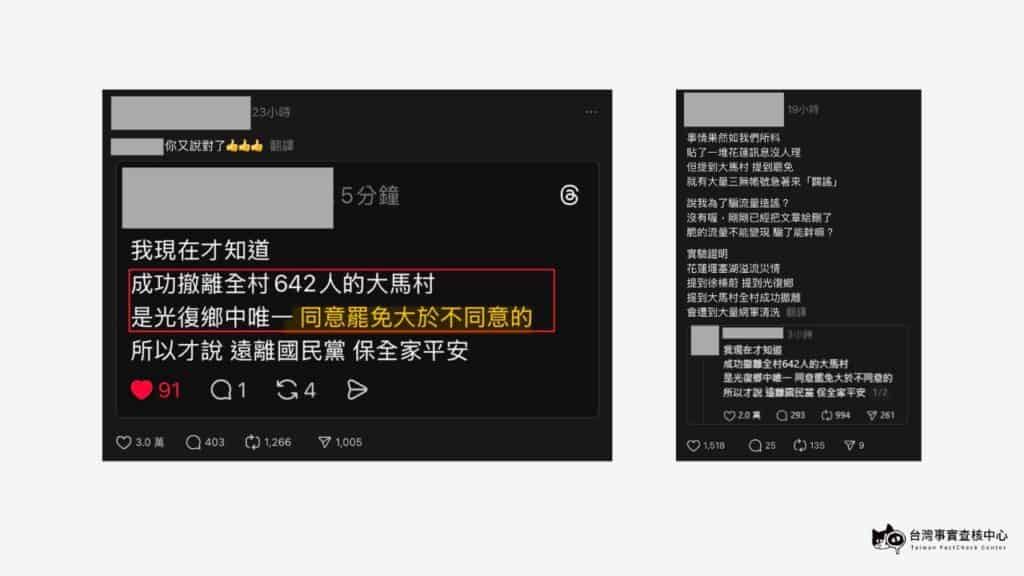 馬太鞍溪堰塞湖9月23日溢流潰壩,大量泥水淹覆花蓮光復鄉,造成嚴重傷亡和災損。隨後在社群平台Threads流傳訊息,宣稱「我現在才知道 成功撤離全村的642人的大馬村 是光復鄉中唯一同意罷免大於不同意的」。