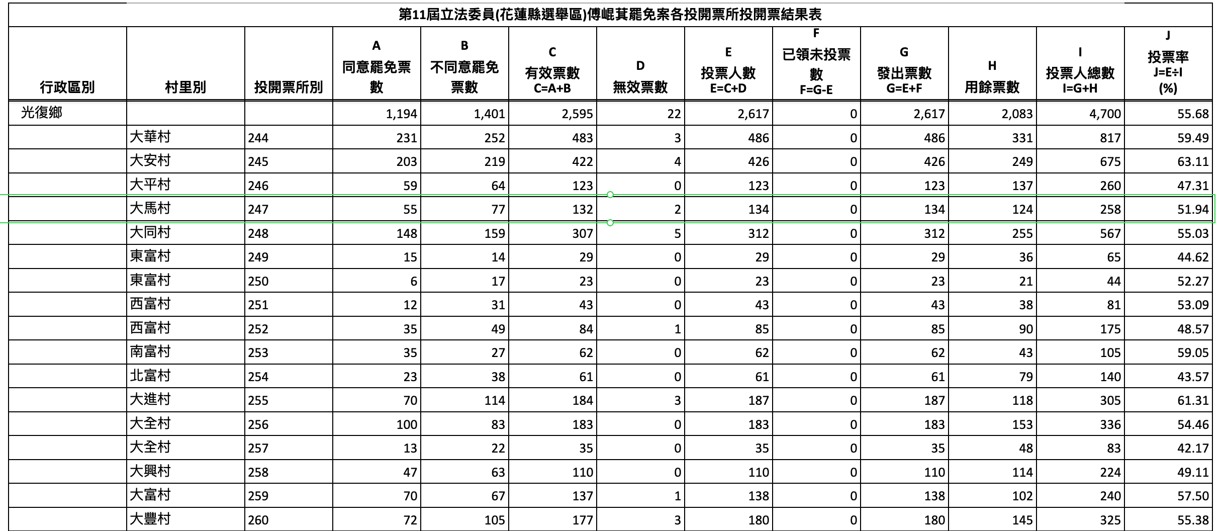 (一)查核中心檢視中選會官網公布7月26日罷免立委傅崐萁投票結果,顯示光復鄉大馬村投票結果為同意55票、不同意77票。