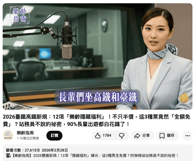 近期網路流傳影片宣稱,2026年台鐵高鐵針對高齡購票新規定,有內行人才懂的「3 種隱藏買法」。這是AI生成影片,夾雜大量錯誤資訊,並非可信來源。