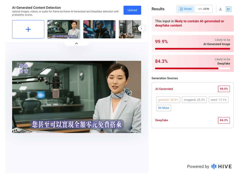 一、使用AI生成影像鑑識軟體「Hive moderation」檢測發現,網傳影片有極高機率為AI生成。