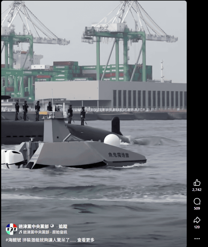 由台灣造船公司製造的「海鯤號」潛艦3月12日上午出海執行第六次潛航測試。台船同時出動自行研製的無人艇「奮進魔鬼魚」伴護出港。但有網民指出,在「奮進魔鬼魚」的駕駛艙裡「竟然有一個人」。網傳貼文質疑,「無人艇裡面坐人 你們都不會覺得哪裡怪怪的嗎?」