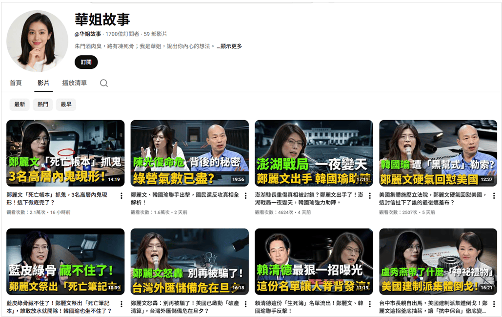 網傳影片來自YT帳號「華姐故事」,該頻道大量發布鄭麗文相關影片。