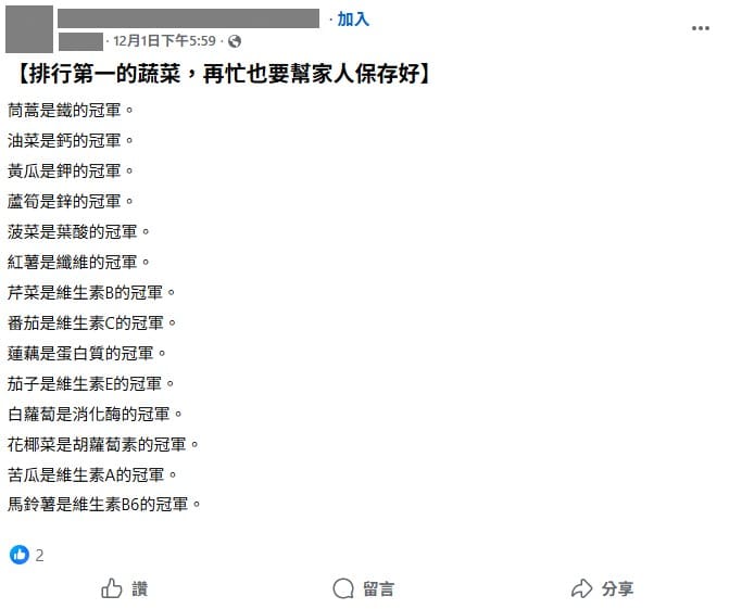 一、營養師表示,網傳「蔬菜營養素含量冠軍」排行榜,提及的營養素含量都與實際的營養資料不符,且有分類錯誤的問題,紅薯、蓮藕、馬鈴薯並不屬於蔬菜類,而是屬於五穀根莖類。