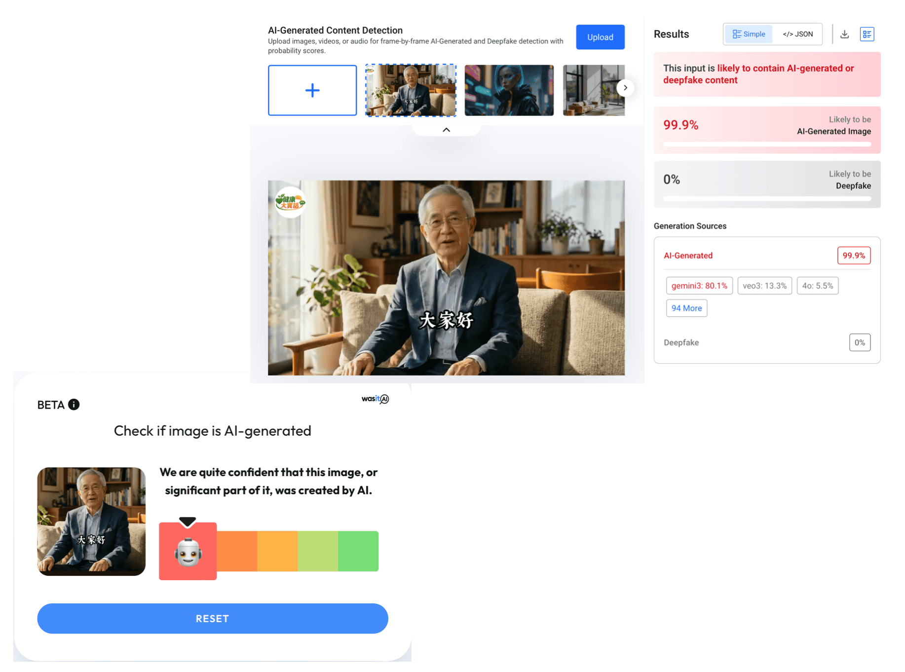 (一)該影片來源為YouTube頻道「健康大實話」,頻道IP顯示是在美國,頻道影片多是搭配大量AI生成圖,且該影片資訊欄下方已被標示變造或合成的內容,顯示聲音或影像經過大幅編輯或為數位生成。查核記者也運用Hive Moderation、Was it AI等線上AI偵測工具檢測網傳影片,發現網傳影片有極高機率為AI生成,並非真實影像。