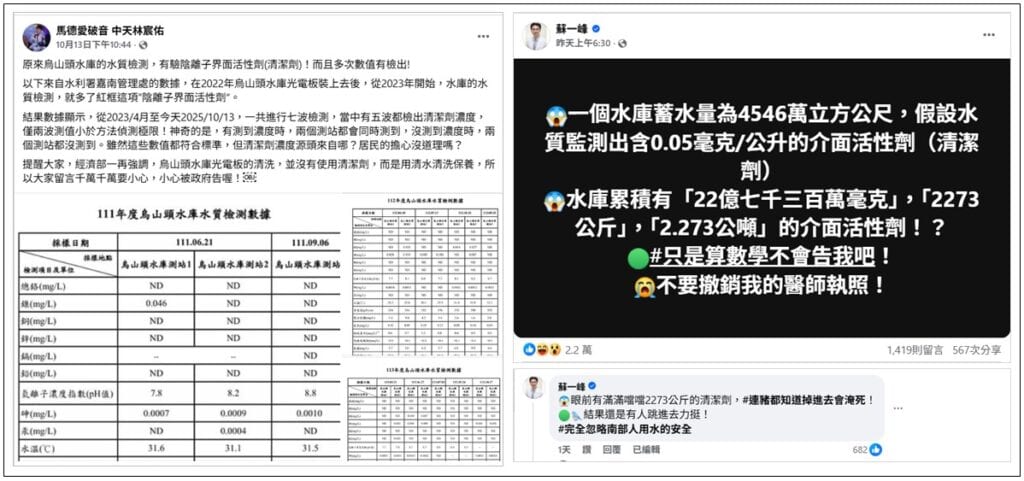 有記者在社群貼文聲稱,依據烏山頭水庫水質檢測,5次驗出「清潔劑濃度」,質疑有使用清潔劑清洗光電板。