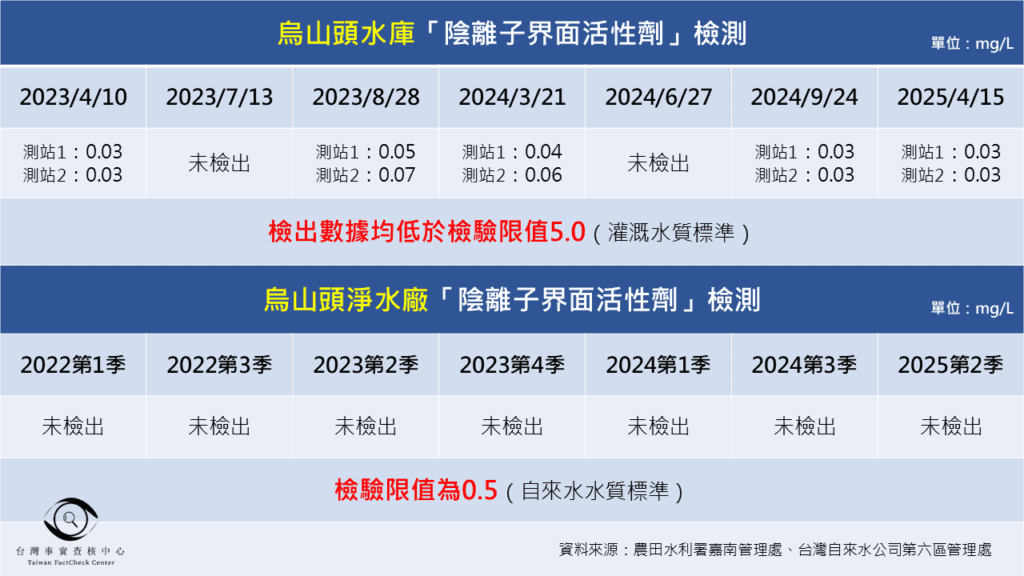 網路流傳的烏山頭水質檢測來自農業部農田水利署所公布報告,所謂驗出「清潔劑濃度」,實際是指「陰離子界面活性劑」檢出值。