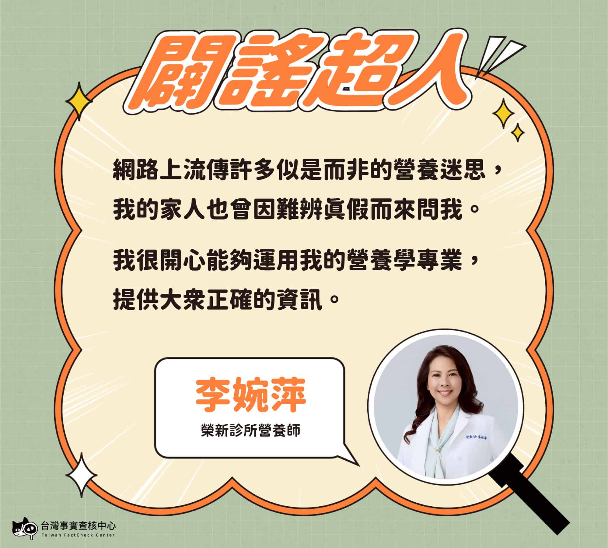 【闢謠超人】榮新診所營養師 – 李婉萍 2026-02-042026-02-04 闢謠超人 專家李婉萍 職稱:榮新診所營養師 專業領域:功能醫學、銀髮營養、婦幼照護 闢謠真心話:網路上流傳許多似是而非的營養迷思,我的家人也曾因難辨真假而來問我。我很開心能夠運用我的營養學專業,提供大眾正確的資訊。 推薦閱讀 冷飯微波對健康無害 煮飯加醋無助降血糖 網傳「蔬菜營養素含量排行榜」分類錯誤且內容不正確