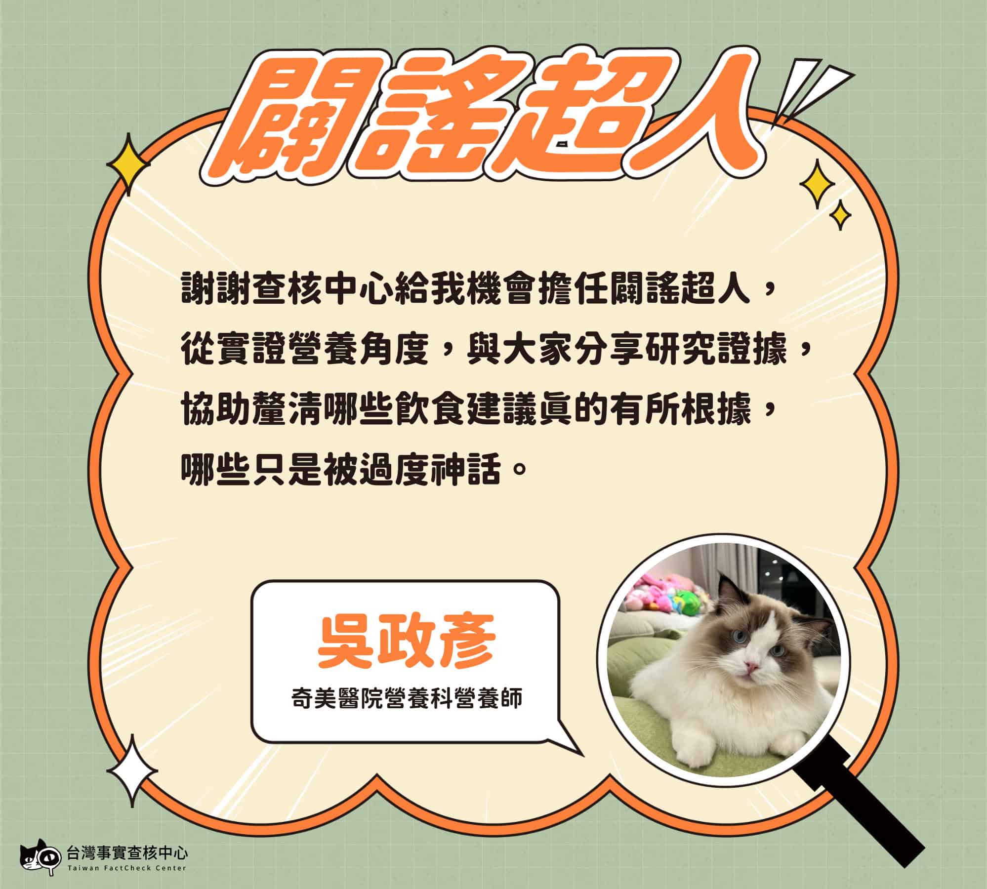 很多營養資訊看起來很專業,其實常被斷章取義。謝謝查核中心給我機會擔任闢謠超人,從實證營養的角度,與大家分享研究證據,協助釐清哪些飲食建議真的有所根據,哪些只是被過度神話。