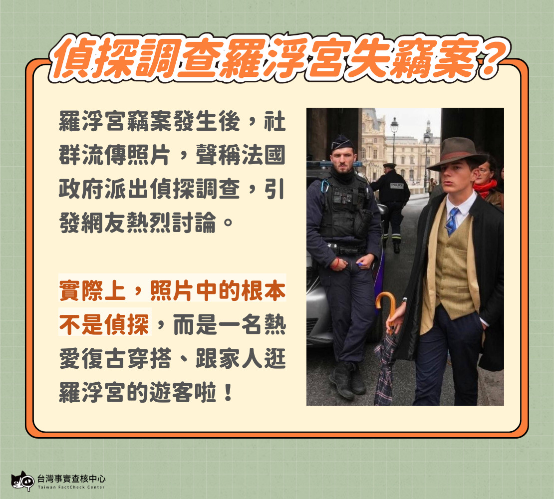 10月19日法國巴黎羅浮宮發生重大失竊案,隨後社群平台有人貼出照片,宣稱法國政府請了一個偵探調查竊案,相關貼文也在中文世界大量流傳。台灣有網友也評論:「在羅浮宮珠寶失竊之後,法國派出了一個長得超帥,但感覺中看不中用的偵探來偵查案件。根據我的生活經驗,這種在穿衣風格細節上處處講究到極致的人,基本上都是靠外型吃飯的。確實給人的感覺很不靠譜。」此貼文在臉書有超過3700人按讚、逾800次分享,在threads更有2800次分享。