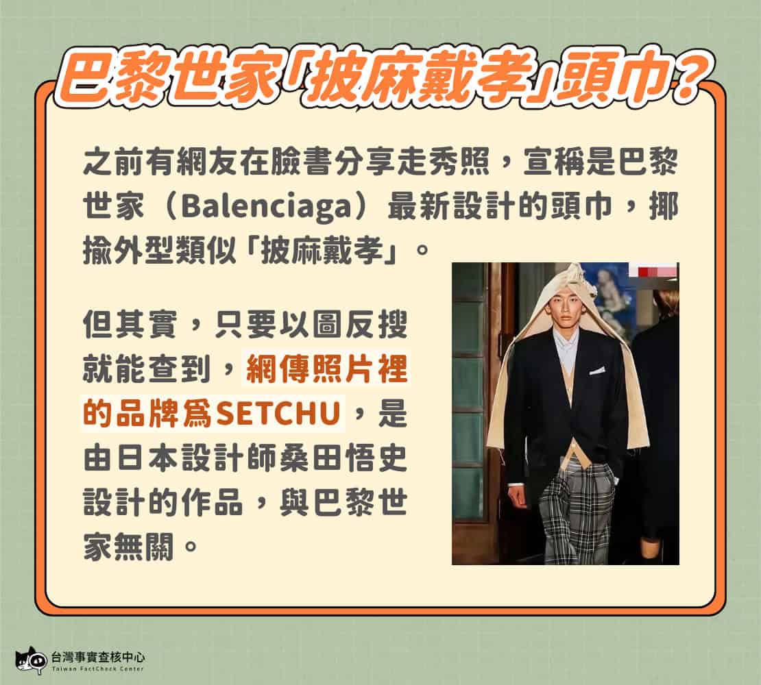 精品Balenciaga(巴黎世家)曾有多款設計引發大眾討論。之前有網友在臉書分享走秀照,宣稱是Balenciaga最新設計的頭巾,類似「披麻戴孝」,紛紛揶揄「在華人圈會滯銷」、「會被老母打死」、「我很確定我不適合時尚」等。
