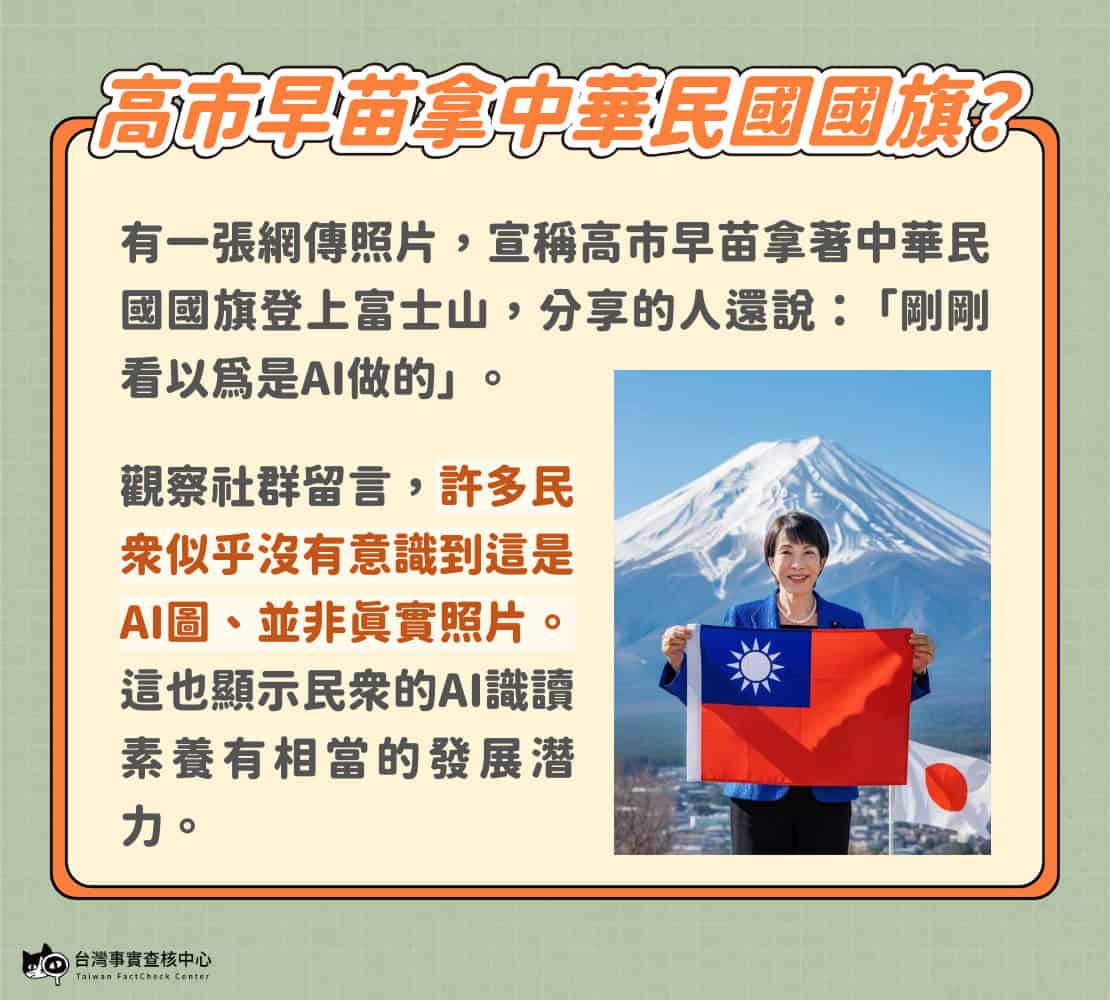 其中,社群流傳一張照片,宣稱高市早苗拿著中華民國國旗登上富士山,分享的人還說:「剛剛看以為是AI做的」;觀察社群留言,許多民眾似乎沒有意識到這是AI圖、並不是真實照片。這也顯示民眾的AI識讀素養有相當的發展潛力。