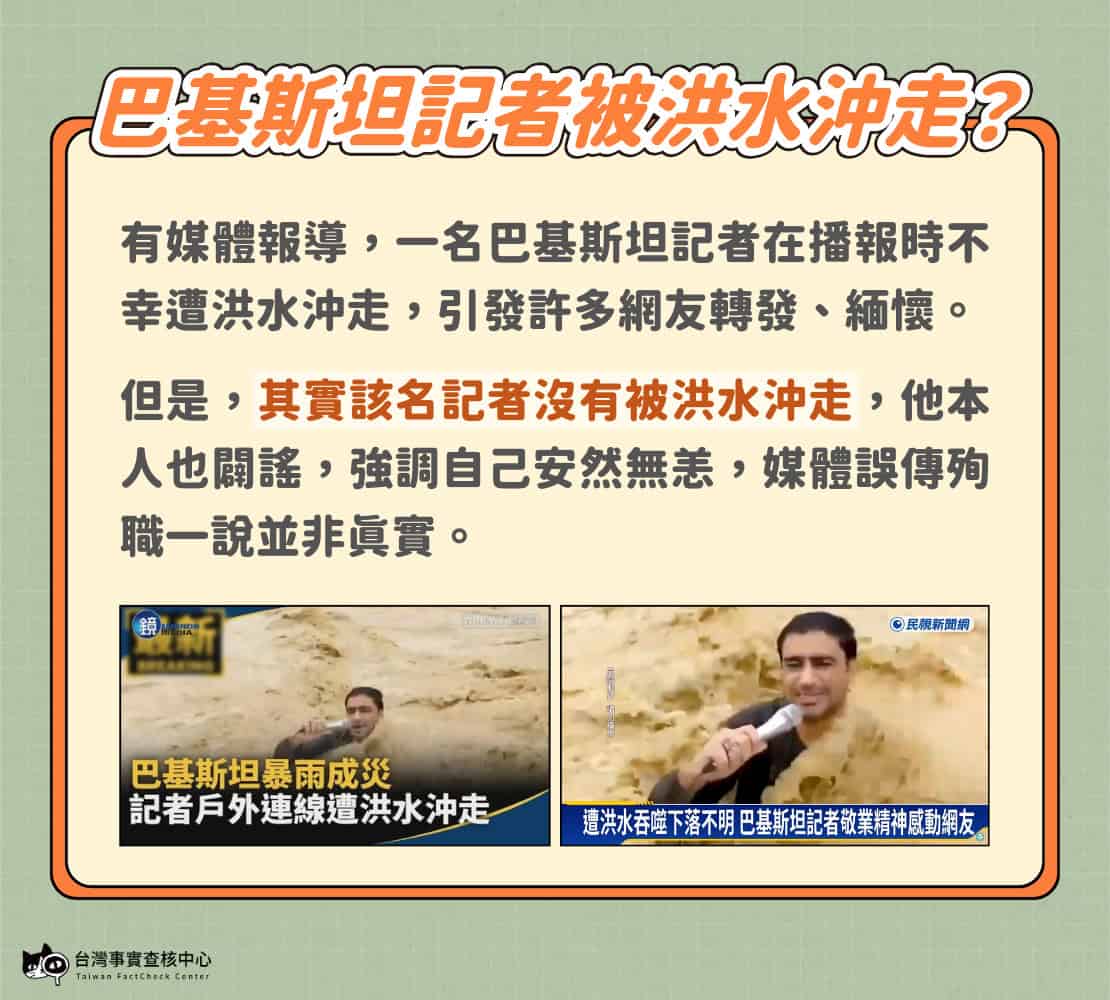 巴基斯坦2025年6月26日進入雨季,洪災頻傳。有台灣媒體7月18日報導,一名巴基斯坦記者在播報時不幸遭洪水沖走、下落不明。報導引用畫面,還以「這是他被洪水吞噬前,留給世界的最後一句話」形容,引發許多網友轉發,表達緬懷。