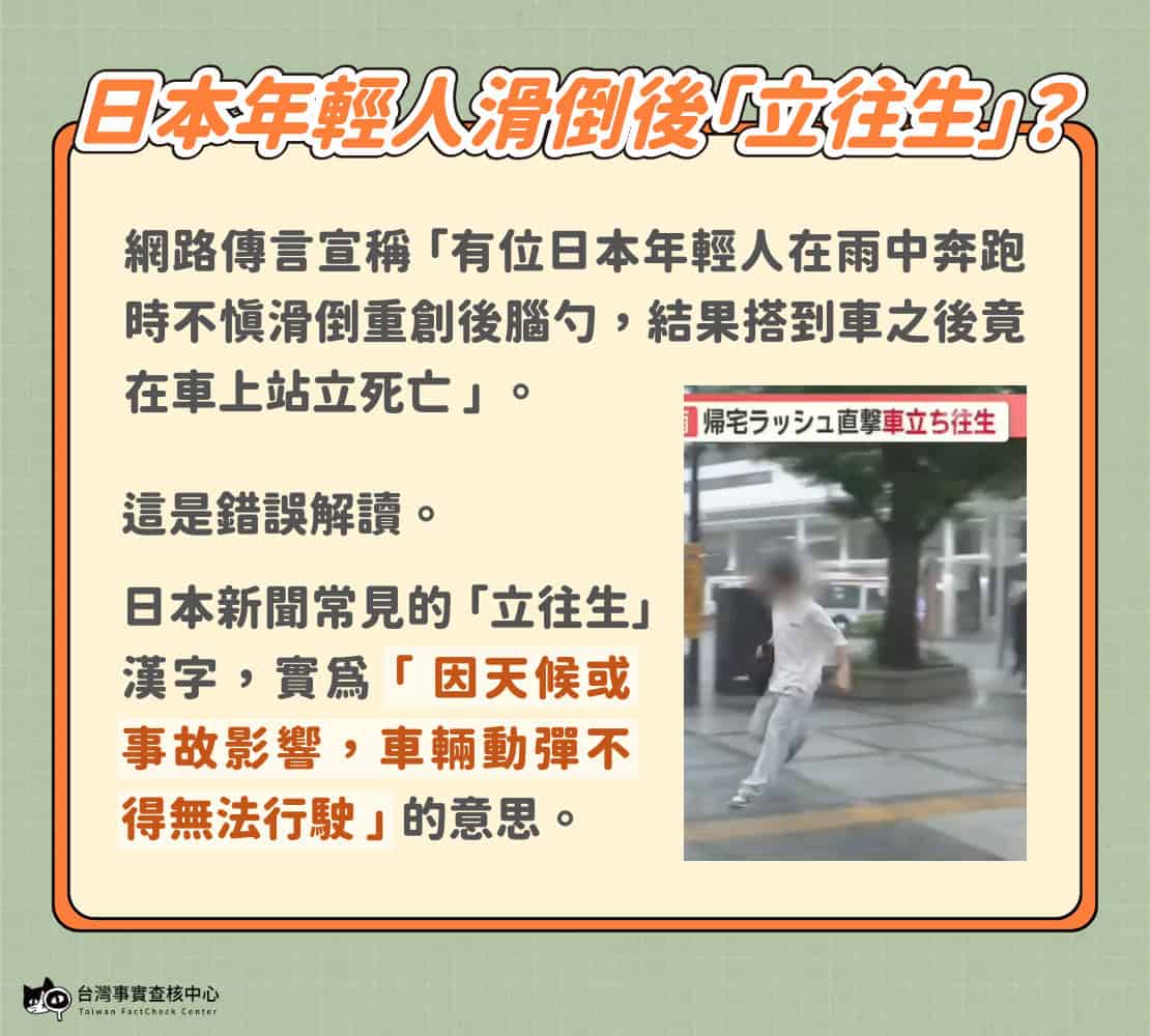 網傳「日本新聞報導男子滑倒後在車上站立死亡」為誤解日文詞義