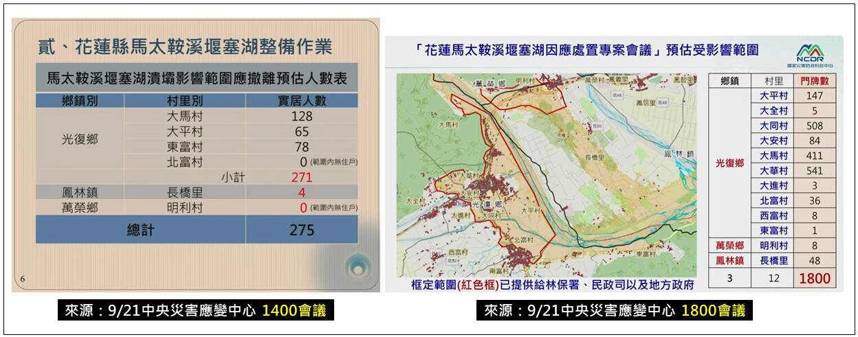 政院記者會中,林保署證實8月12日曾撤離花蓮697人,內政部長劉世芳解釋,隨著颱風逼近,堰塞湖有溢流、潰壩的可能,因此9月21日決定擴大疏散範圍,疏散人數也增加為1837戶約8000多人,為了保全最多人命,提出收容、依親、垂直避難3種疏散方式。