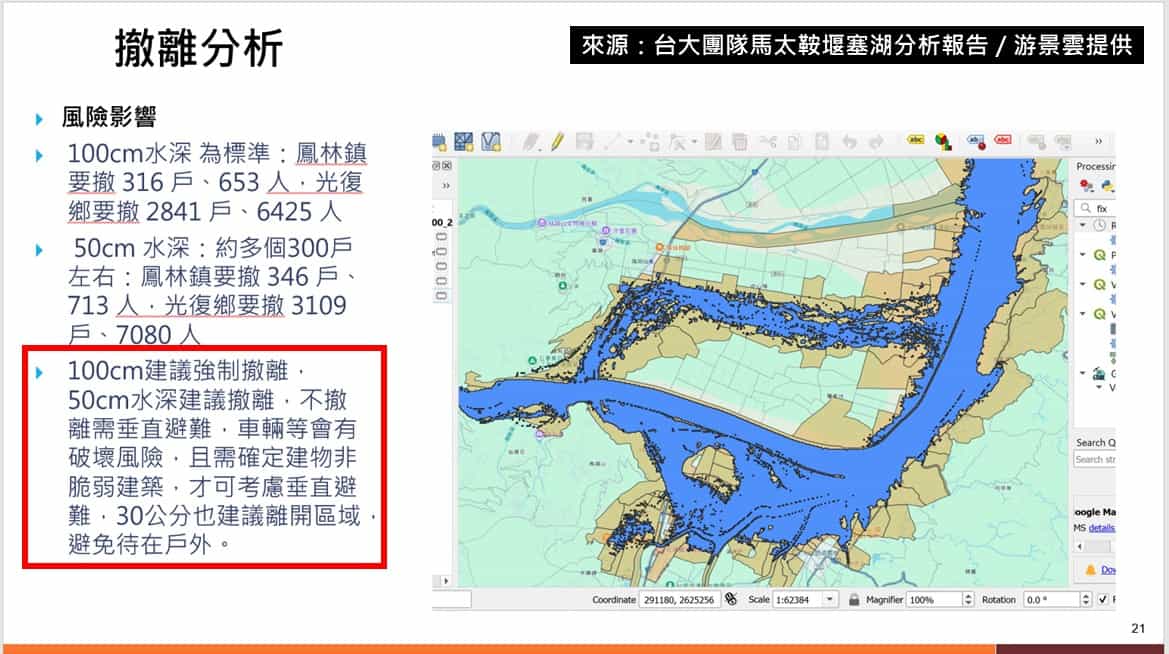 台大團隊成員之一、台大土木系教授游景雲指出,台大報告19日已經交給內政部,因疏散範圍較林保署評估為大,因此中央災害應變中心找來台大、林保署、花蓮縣府,以及其他單位,於21日再度討論疏散範圍。