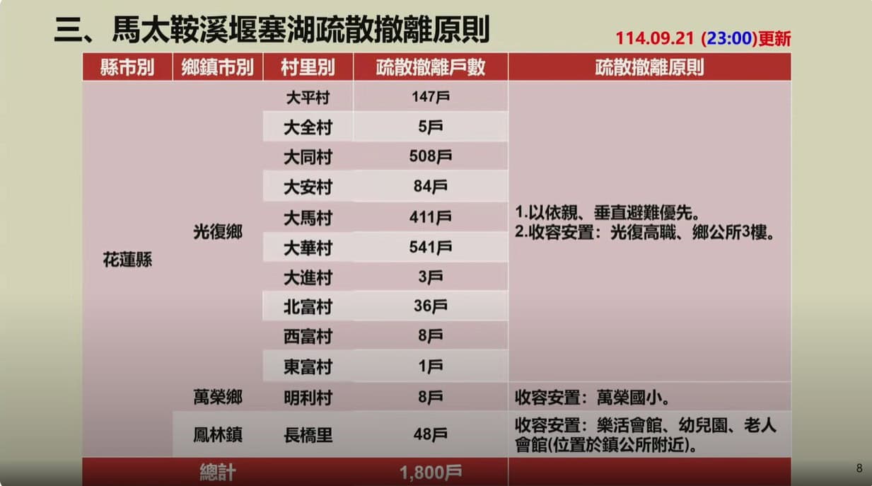 依照花蓮縣府公開說法,21日專案會議後約傍晚5點,就已接獲中央通知擴大疏散至1800戶,並即刻製作清冊,與國軍合作進行撤離。