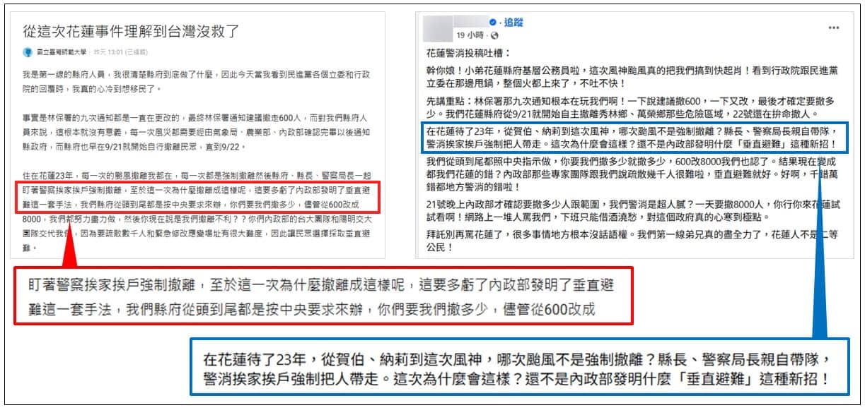 同時網路社群也流傳自稱「花蓮縣府人員」、「花蓮警消人員」匿名文章,同樣指出中央發明「垂直避難」,影響強制撤離。