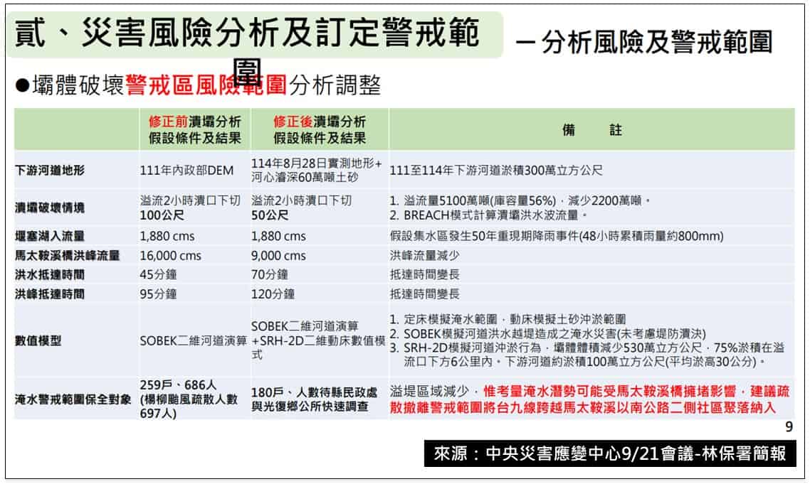 林志平解釋,所有評估都有假設條件,當時堤防已經加高,耐洪能力提升,因此是在假設堤防沒有潰決的條件下,再考量下游已經濬深60萬噸土砂等條件綜合評估,認為跟8月比較,「溢堤區域減少」,因此縮減疏散區。