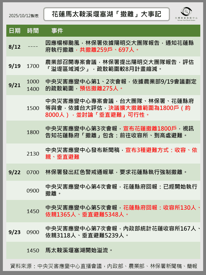 為何政府先後提出不同版本的災害評估?為何疏散範圍有巨大落差?疏散人數一日擴增為8000人,納入「垂直避難」是否適合?這些疑問在災後仍持續熱議,查核中心依據公開資料,並採訪相關當事人,還原決策脈絡,釐清基本事實提供外界參考。