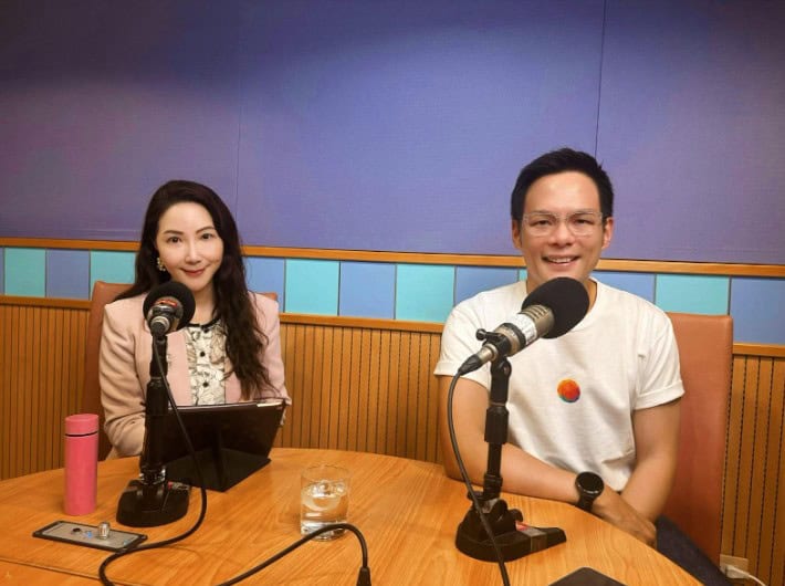 台灣大哥大總經理林之晨(右)接受國立教育廣播電台節目及Podcast節目《新聞真假掰》主持人黃兆徽(左)專訪。